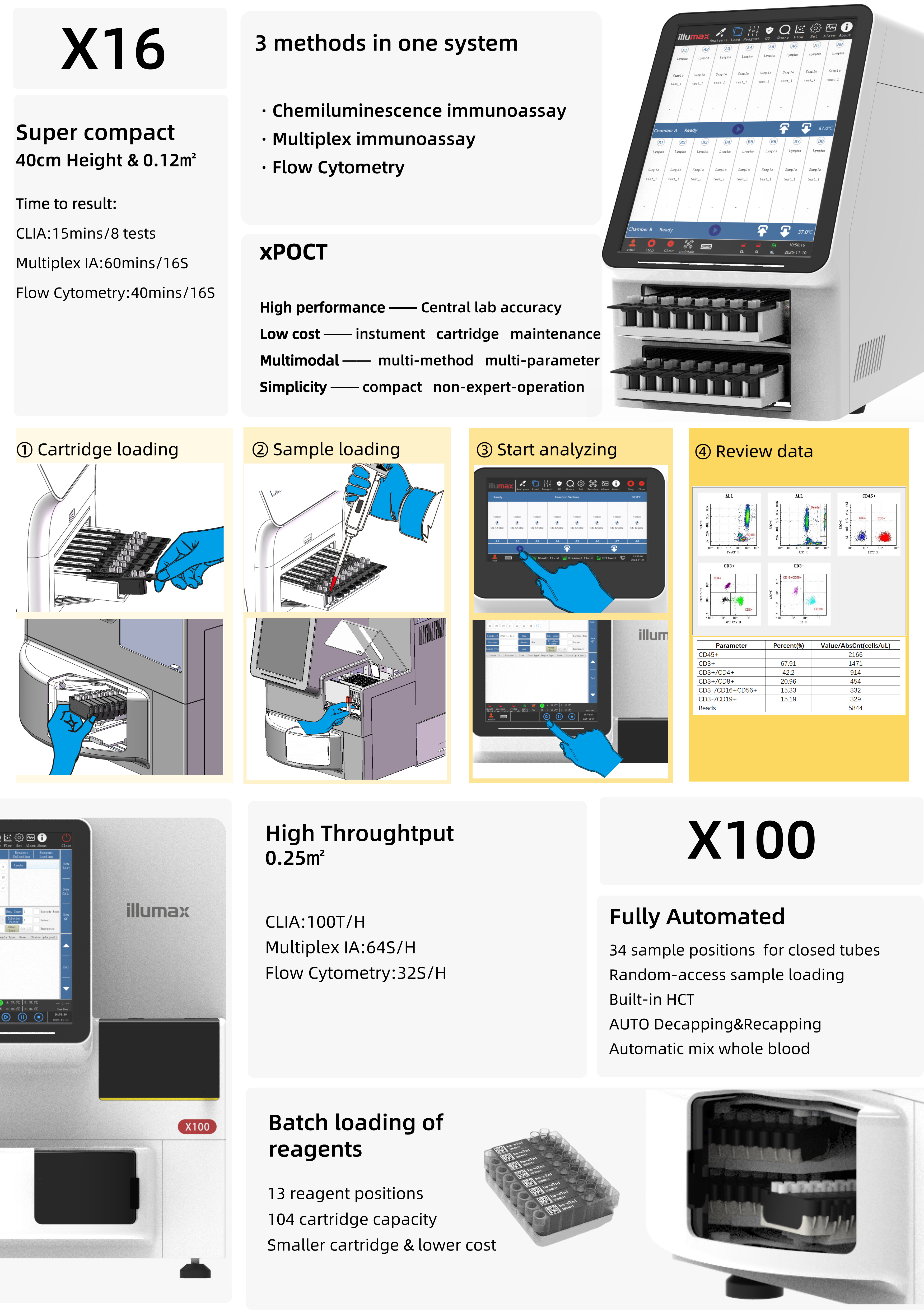 On-demand testing: 1 patient, 1 test, 1 result, ready-to-use reagents. Two sections work independently.