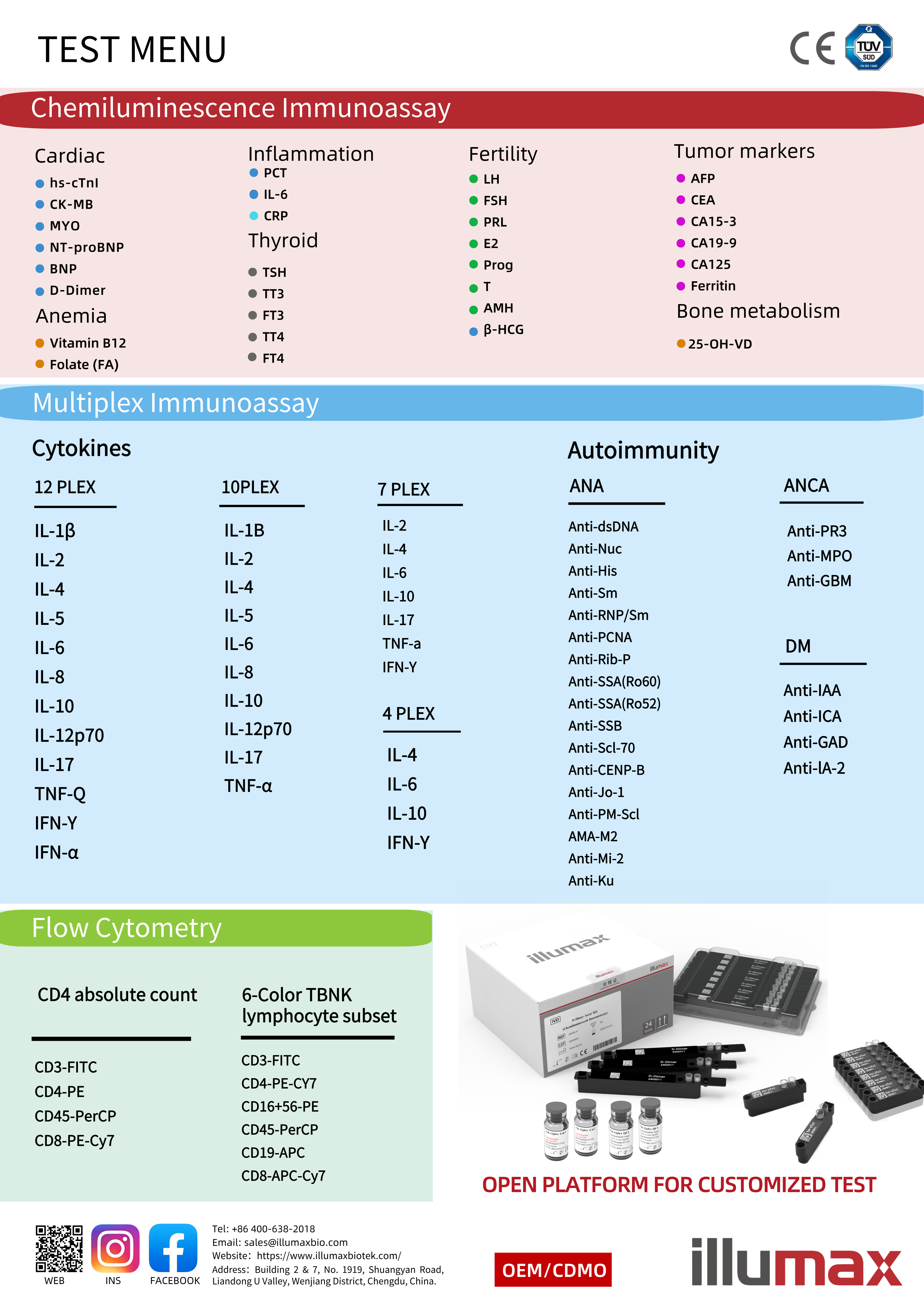 We also offer OEM & ODM solutions and comprehensive test menu such as cardiac, inflammation, fertility, thyroid and tumor makers. We can provide one-stop services from instrument customization, reagent matching, CDMO to product registration.